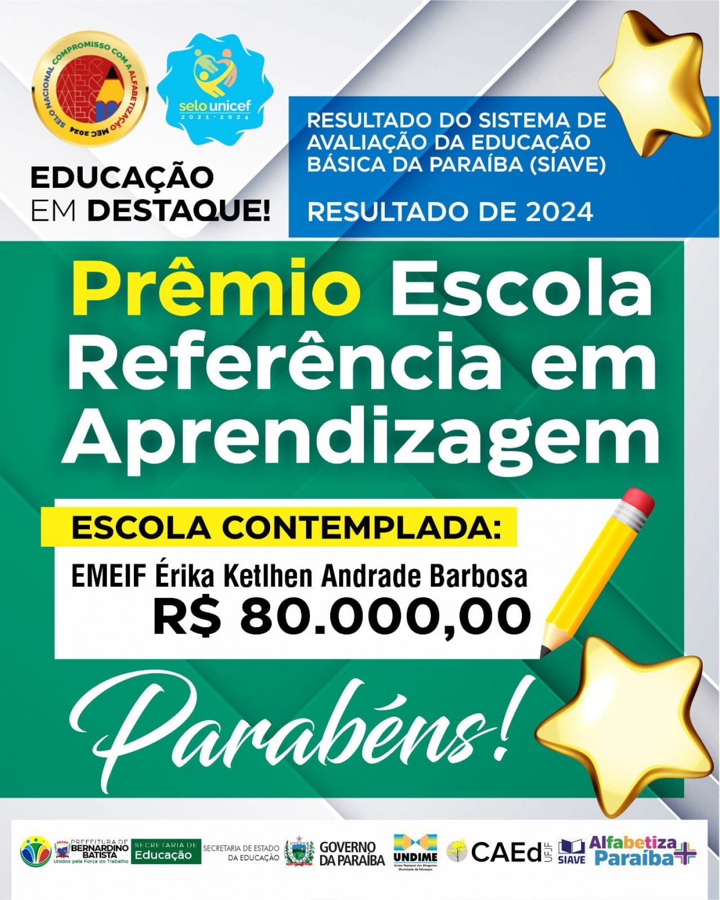 A honraria integra o Programa Alfabetiza Mais Paraíba, que reconhece escolas e municípios que se destacam no compromisso com a alfabetização das crianças na idade certa. No município, a grande vencedora foi a EMEIF Érika Kethlen Andrade Barbosa, que se destacou pelos excelentes resultados no Sistema de Avaliação da Educação Básica da Paraíba (Siave) no último ano de 2024.