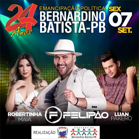 Em entrevista concedida na manha de hoje (16) no programa comando geral da Radio Mais FM de Uirauna/PB, o prefeito de Bernardino Batista, Gervazio Gomes (PSB) anunciou, em primeira mão, a programação oficial dos 24 anos de emancipação política do município.