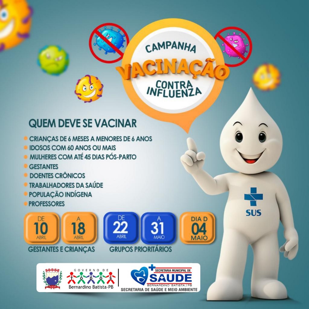 Em Bernardino Batista, todas as Unidades de Saúde estarão disponibilizando a vacina para o público alvo da campanha, que são: idosos a partir de 60 anos, gestantes, puérperas, trabalhadores da saúde, professores, portadores de doenças crônicas não transmissíveis, entre outros.