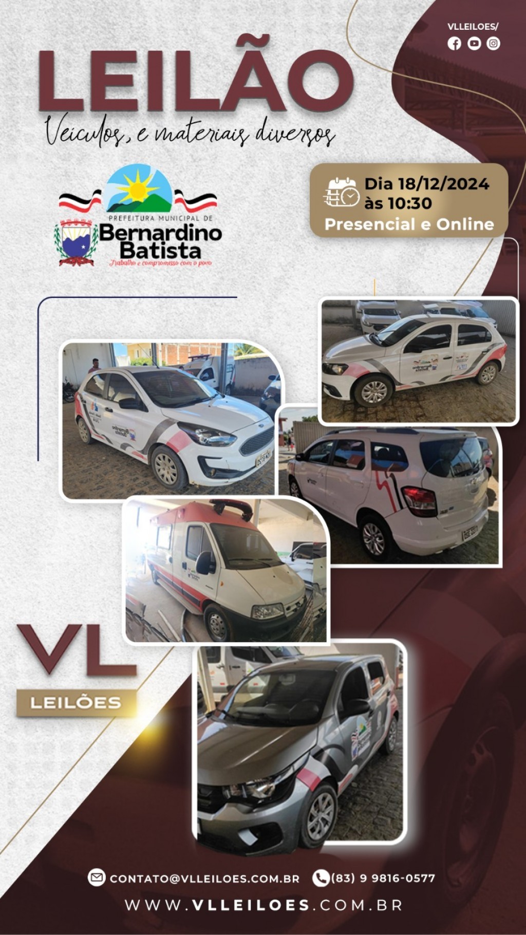 [11:58, 13/12/2024] Evaldo Montes TV: A Prefeitura Municipal de Bernardino Batista realizará no próximo dia 18 de dezembro, leilão de veículos e materiais diversos que não são mais úteis a Administração Municipal.