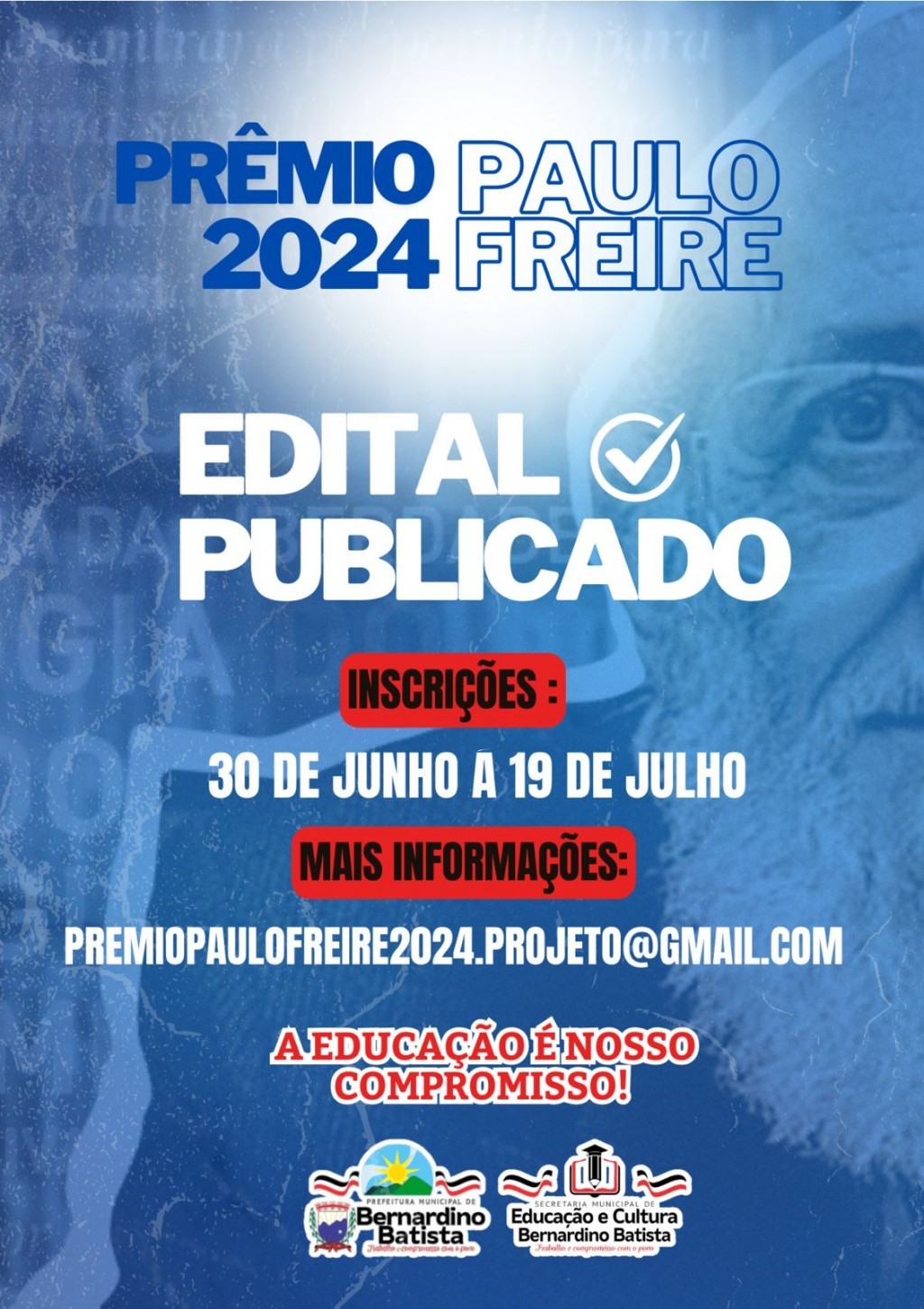 A Prefeitura Municipal de Bernardino Batista PB, através da Secretaria de Educação, tem a honra de anunciar a abertura das inscrições para o Prêmio Paulo Freire 2024. O prêmio celebra o compromisso com a educação de qualidade, reconhecendo iniciativas inovadoras e transformadoras no nosso município.