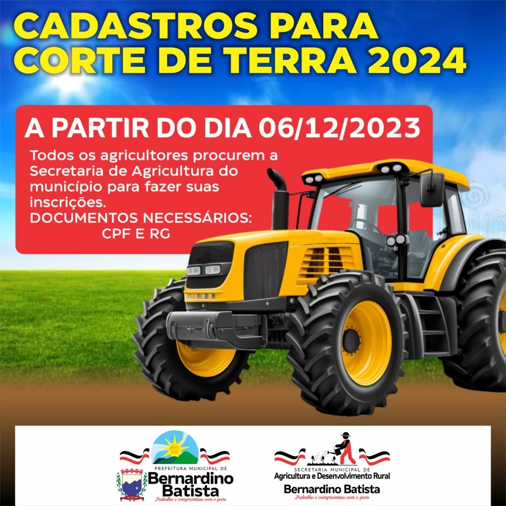 A Prefeitura Municipal de Bernardino Batista, por meio da Secretaria de Agricultura comunica a abertura do cadastro para o serviço de corte de terra destinado aos agricultores do município. Essa iniciativa visa proporcionar o suporte essencial aos produtores rurais, impulsionando o desenvolvimento da agricultura local.