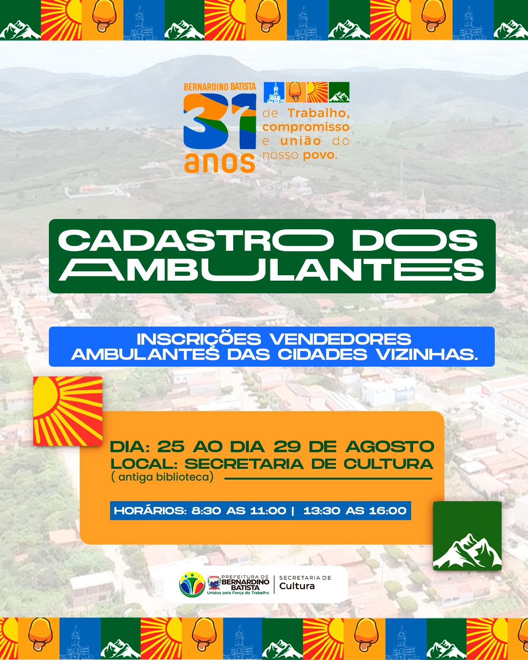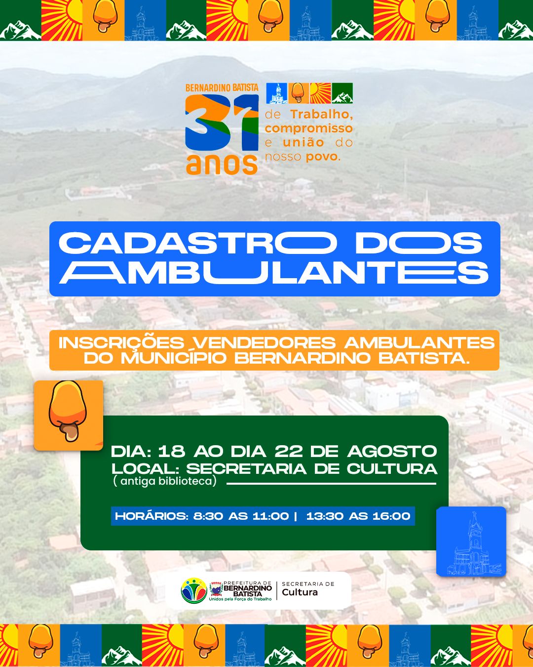 A Prefeitura de Bernardino Batista, por meio da Secretaria de Cultura, está convocando vendedores ambulantes para se cadastrarem e garantirem espaço para comercialização durante o evento.