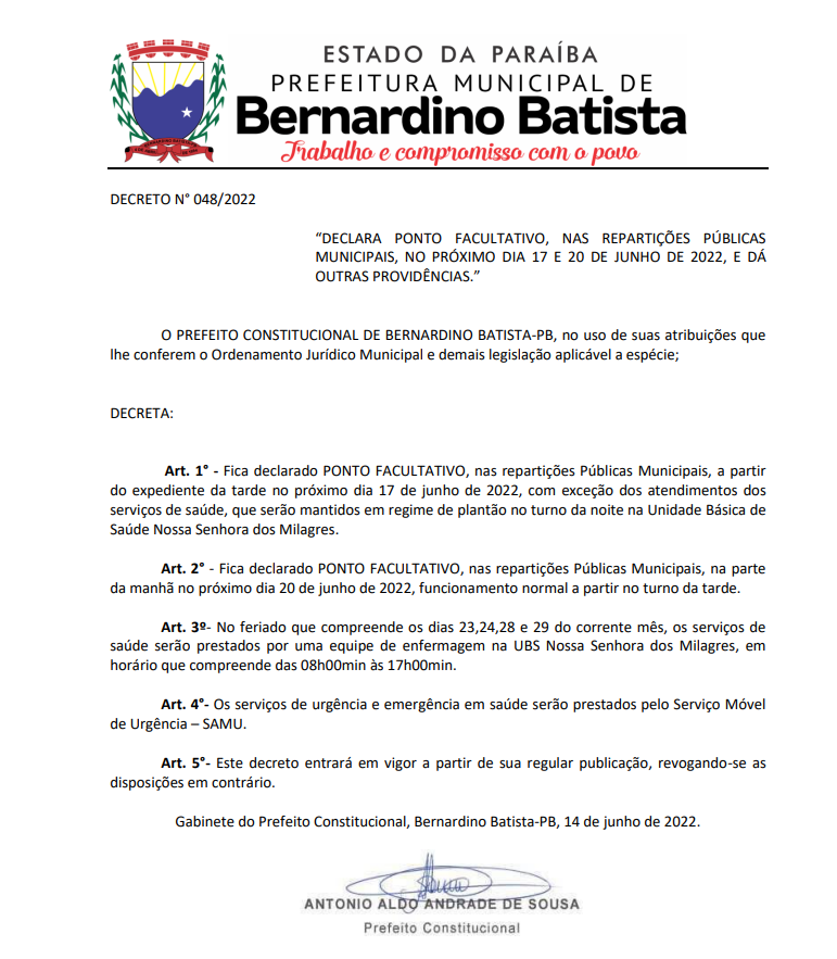 Art. 1° - Fica declarado PONTO FACULTATIVO, nas repartições Públicas Municipais, a partir do expediente da tarde no próximo dia 17 de junho de 2022, com exceção dos atendimentos dos serviços de saúde, que serão mantidos em regime de plantão no turno da noite na Unidade Básica de Saúde Nossa Senhora dos Milagres. Art. 2° - Fica declarado PONTO FACULTATIVO, nas repartições Públicas Municipais, na parte da manhã no próximo dia 20 de junho de 2022, funcionamento normal a partir no turno da tarde. Art. 3o- No feriado que compreende os dias 23,24,28 e 29 do corrente mês, os serviços de saúde serão prestados por uma equipe de enfermagem na UBS Nossa Senhora dos Milagres, em horário que compreende das 08h00min às 17h00min. Art. 4°- Os serviços de urgência e emergência em saúde serão prestados pelo Serviço Móvel de Urgência – SAMU. Art. 5°- Este decreto entrará em vigor a partir de sua regular publicação, revogando-se as disposições em contrário. Gabinete do Prefeito Constitucional, Bernardino Batista-PB, 14 de junho de 2022.