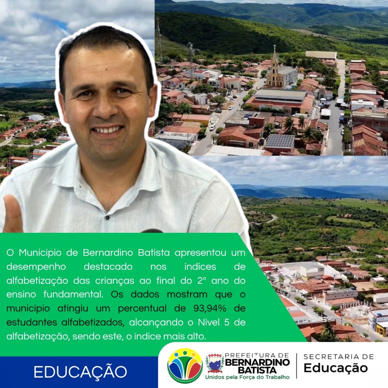 Bernardino Batista registra aumento expressivo em avaliação do MEC, atingindo o percentual de 93,94% de suas crianças alfabetizadas na idade certa, saindo de 61,4% para esse patamar. São dados oficiais do MEC.