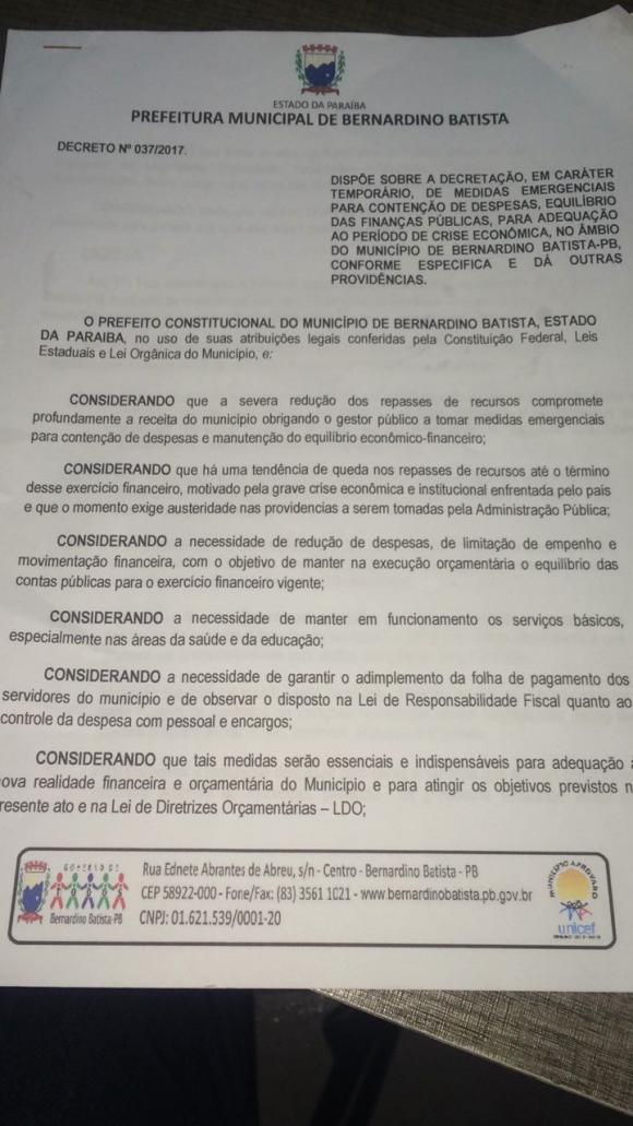 Após a reunião com a classe trabalhadora o chefe do executivo municipal baixou o decreto emergencial de nº 0037/2017 em caráter temporário para adequação do município a crise econômica, as medidas visam a economia em diversos setores da administração.