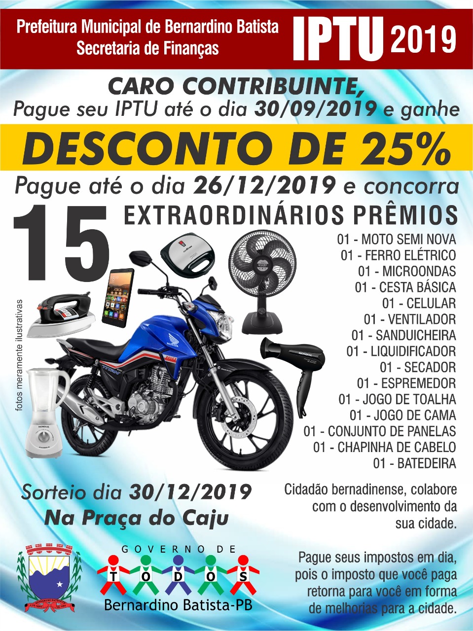 A Prefeitura de Bernardino Batista, através da secretaria de Administração e Finanças comunica que o prazo para o pagamento do IPTU 2019 está se expirando e que o sorteio dos prêmios da campanha ocorrerá no dia 30 de dezembro ás 08h na Praça do Cajú.