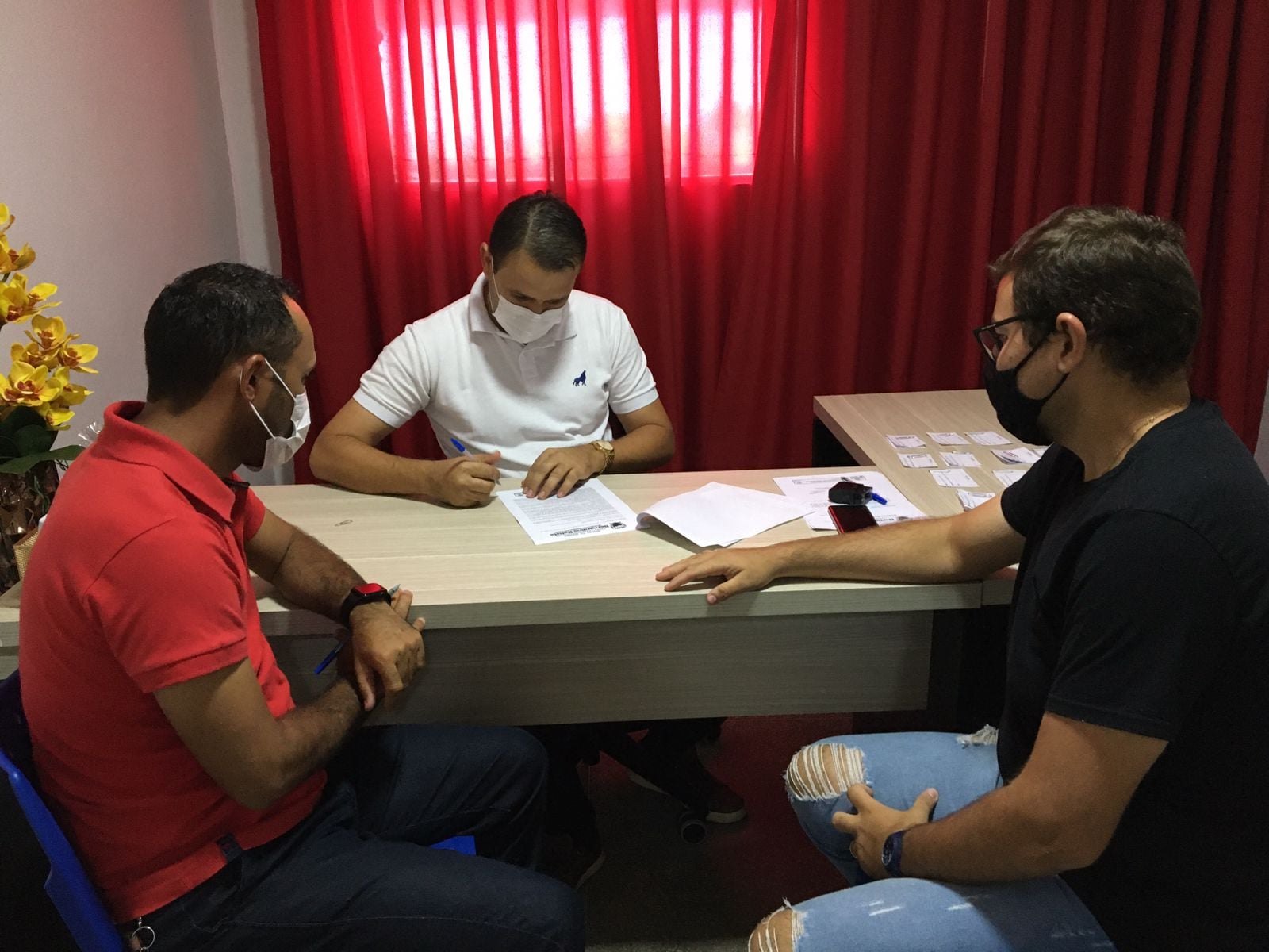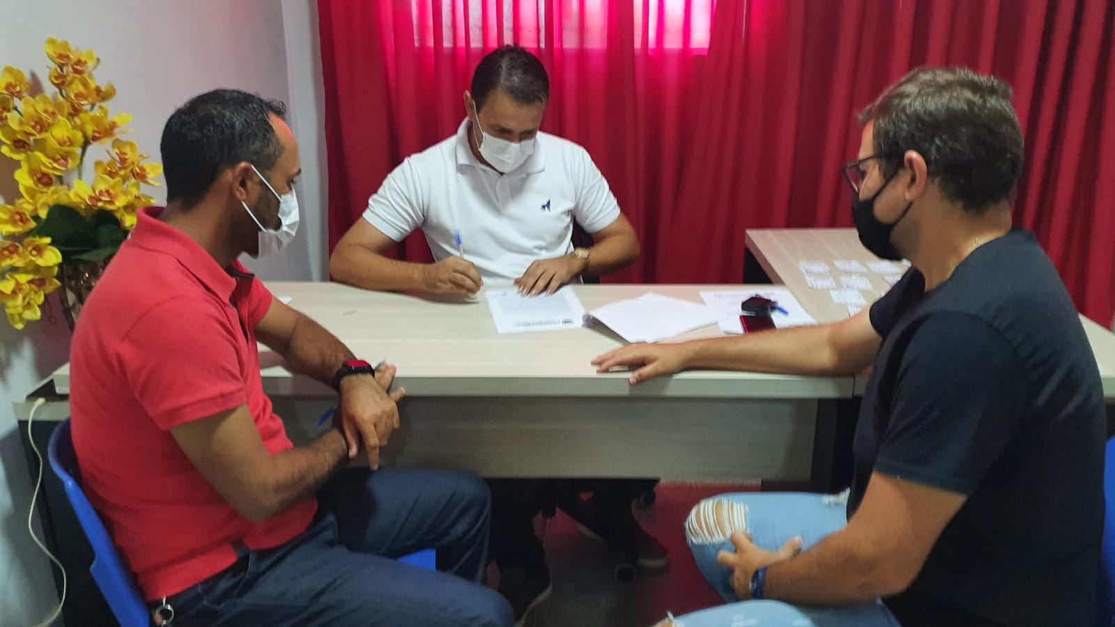 O prefeito de Bernardino Batista, Aldo Andrade recebeu representantes da empresa Dois Irmãos para assinatura de contrato para reforma e ampliação da praça pública da vila Egídio, zona rural do município.