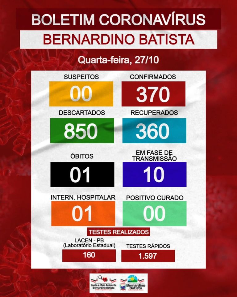 A Secretaria de Saúde e meio ambiente de Bernardino Batista, por meio da Vigilância epidemiológica, informa que até esta Quarta-Feira (27/10), a cidade totaliza 370 casos confirmados.