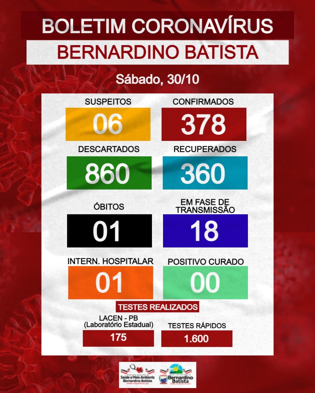 A Secretaria de Saúde e meio ambiente de Bernardino Batista, por meio da Vigilância epidemiológica, informa que até este Sábado (30/10), a cidade totaliza 378a casos confirmados.