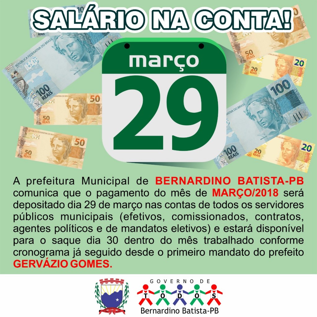 Bernardino Batista: concluindo a elaboração da folha de pagamento do mês de março e nesta sexta feira 29/03 será iniciado o processo de transferências para as contas do funcionários municipais para que, ja no sabado dia 30/03 esteja disponível para saque. março pago dentro do mês trabalhado como os meses anteriores desde o início do 1° mandato do Prefeito Gervazio Gomes.